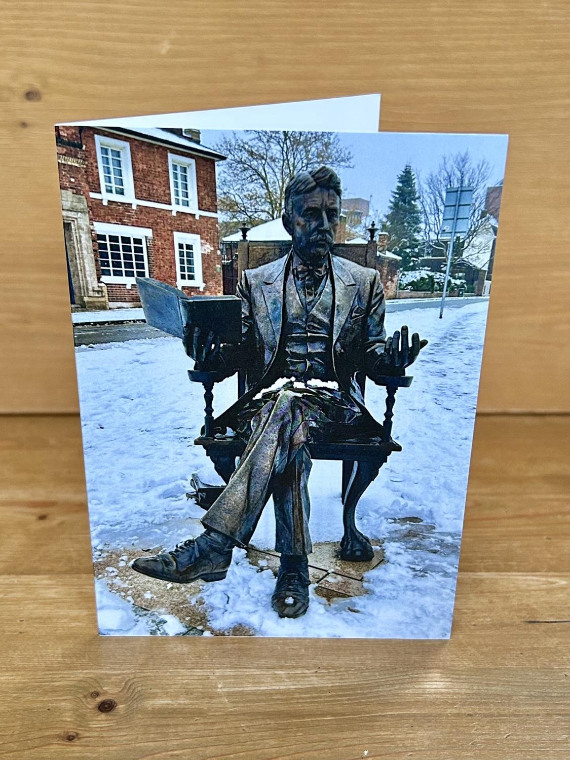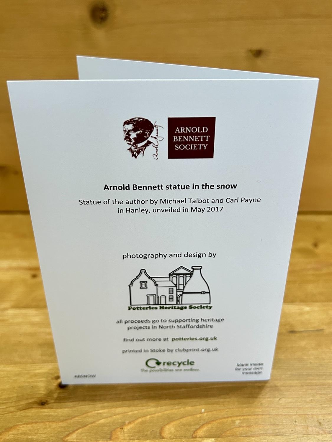 Arnold Bennnet Card with envelope. Photograph of the Arnold Bennett Statue in the snow. Statue of the author by Michael Talbot and Carl Payne in Hanley. A6 size (150mm x 105mm). Blank inside for your own message. Price: £2.00 Quantity *