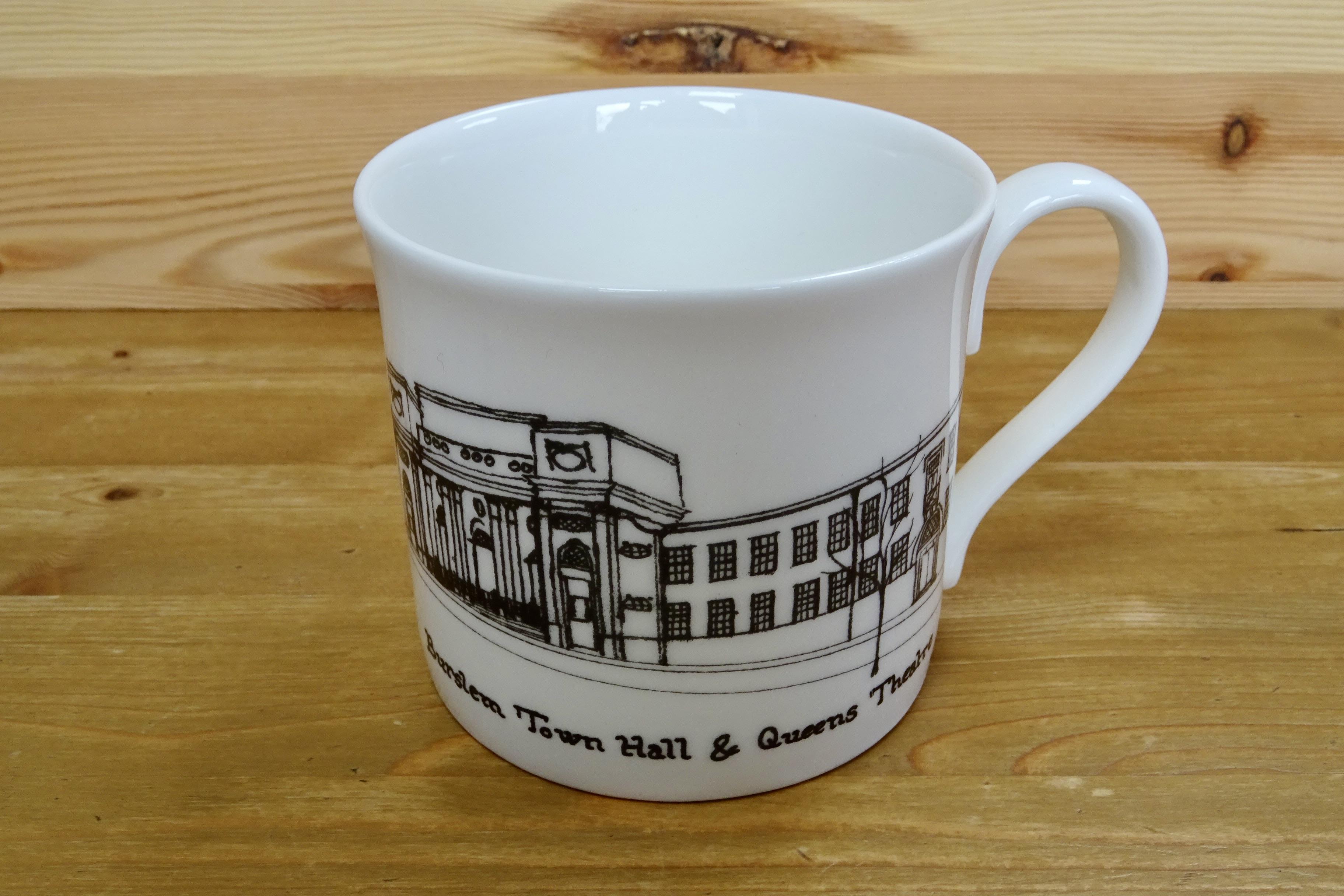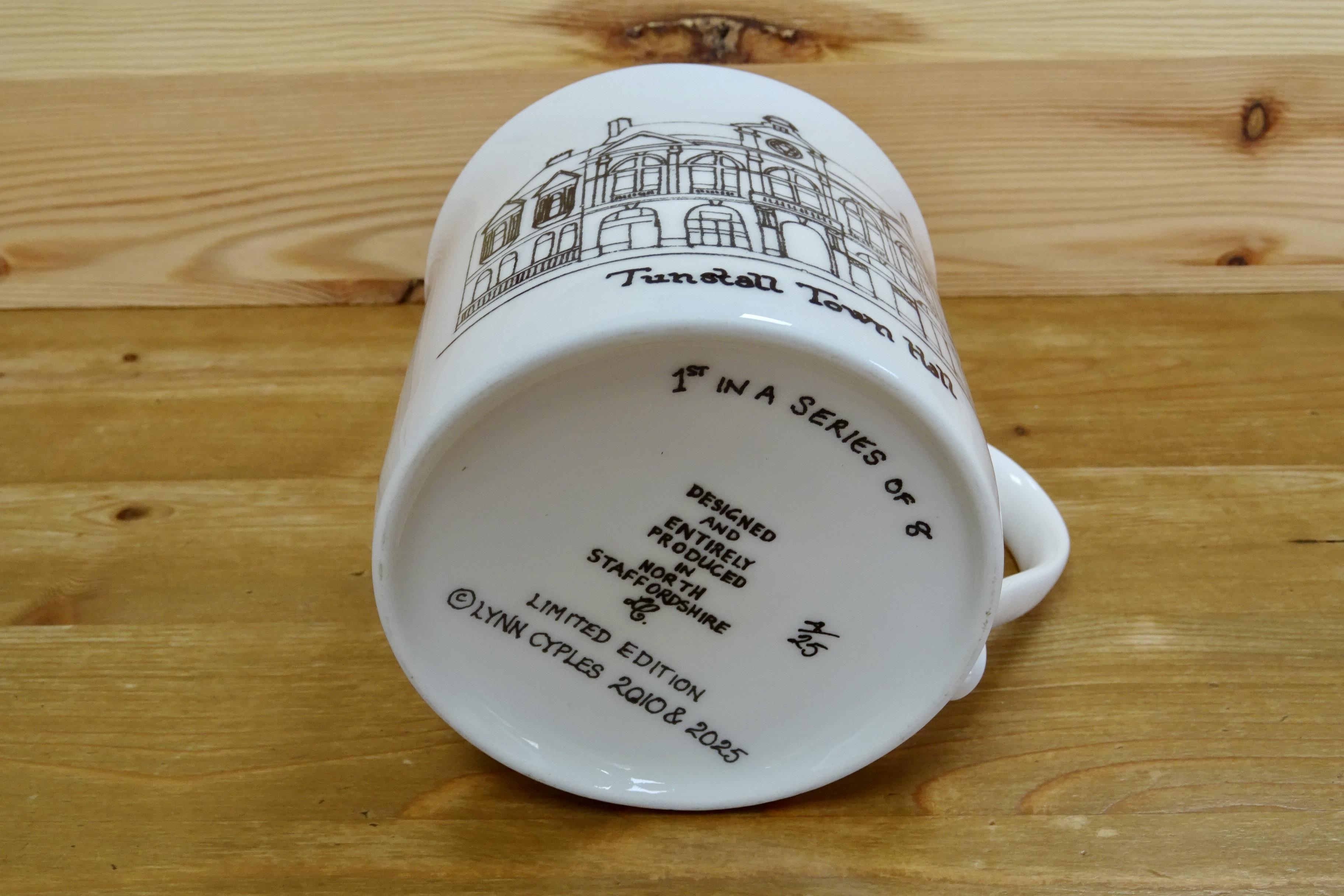 2nd in a series of 8 Centenary Town Hall Mugs - Burslem Town Hall & Queens Theatre. Designed and entirely produced in North Staffordshire by Lynn Cyples. Limited edition of 25. Dimensions: 7.8cm high, 8.6cm wide, 11.8cm inc handle.