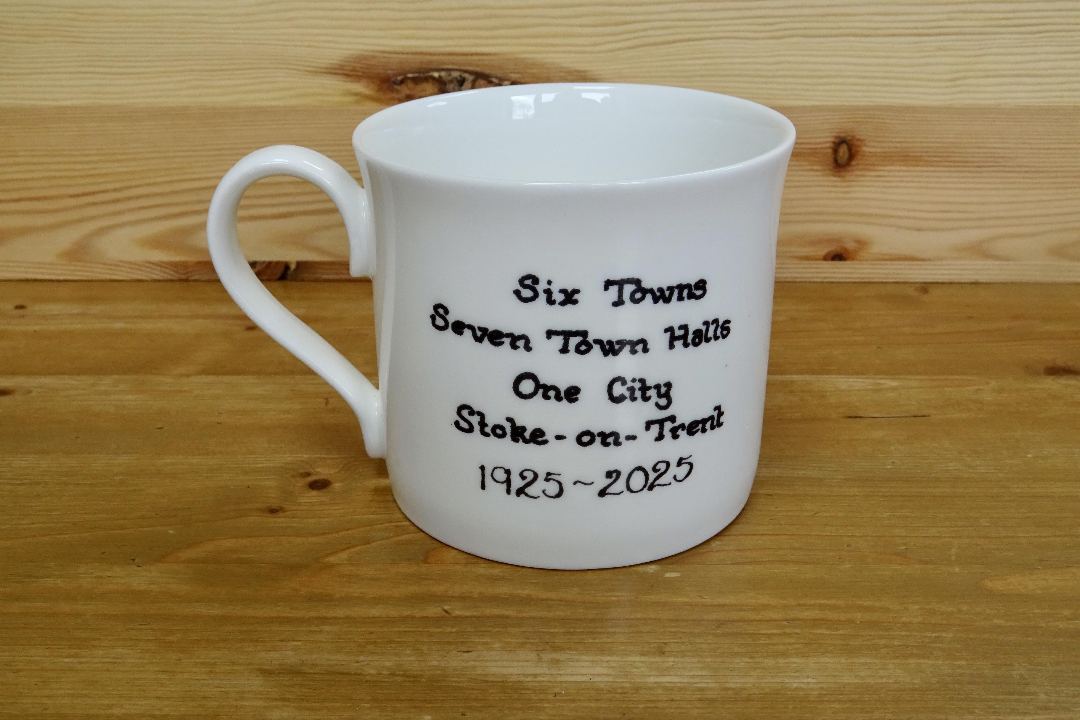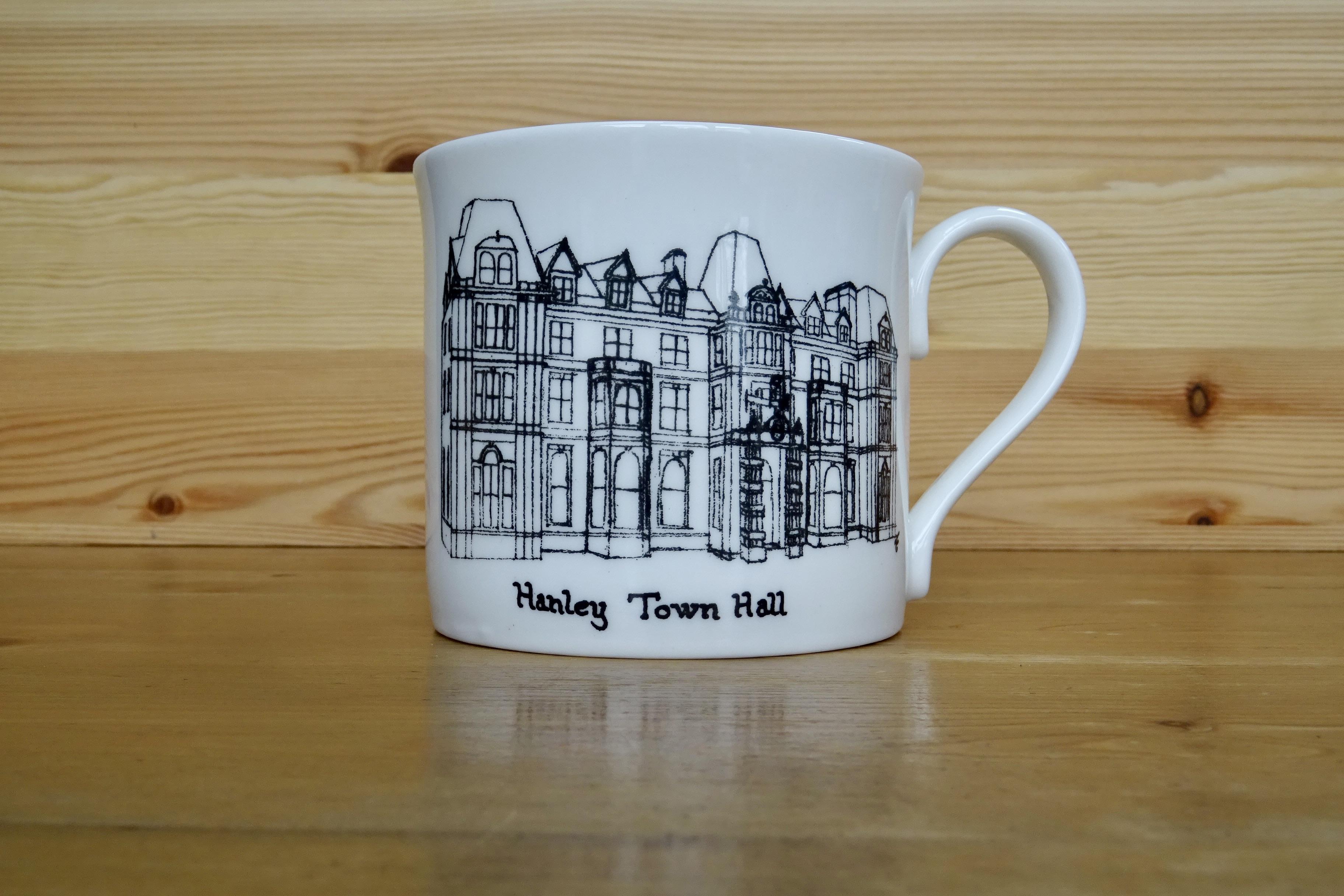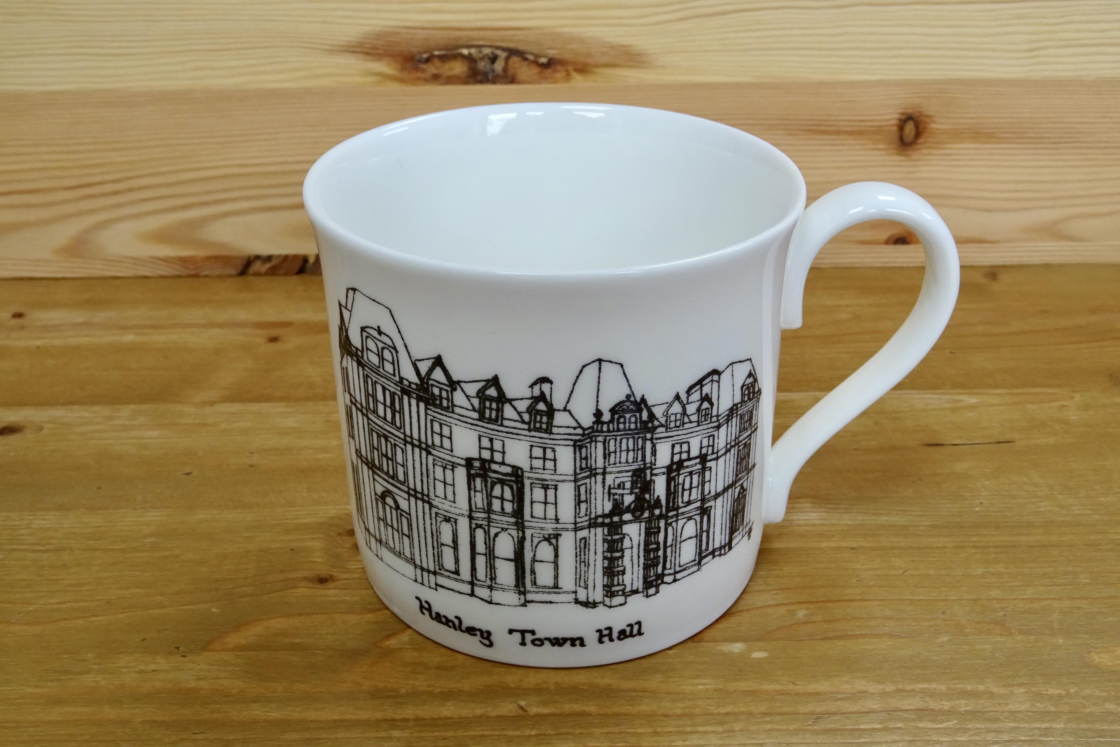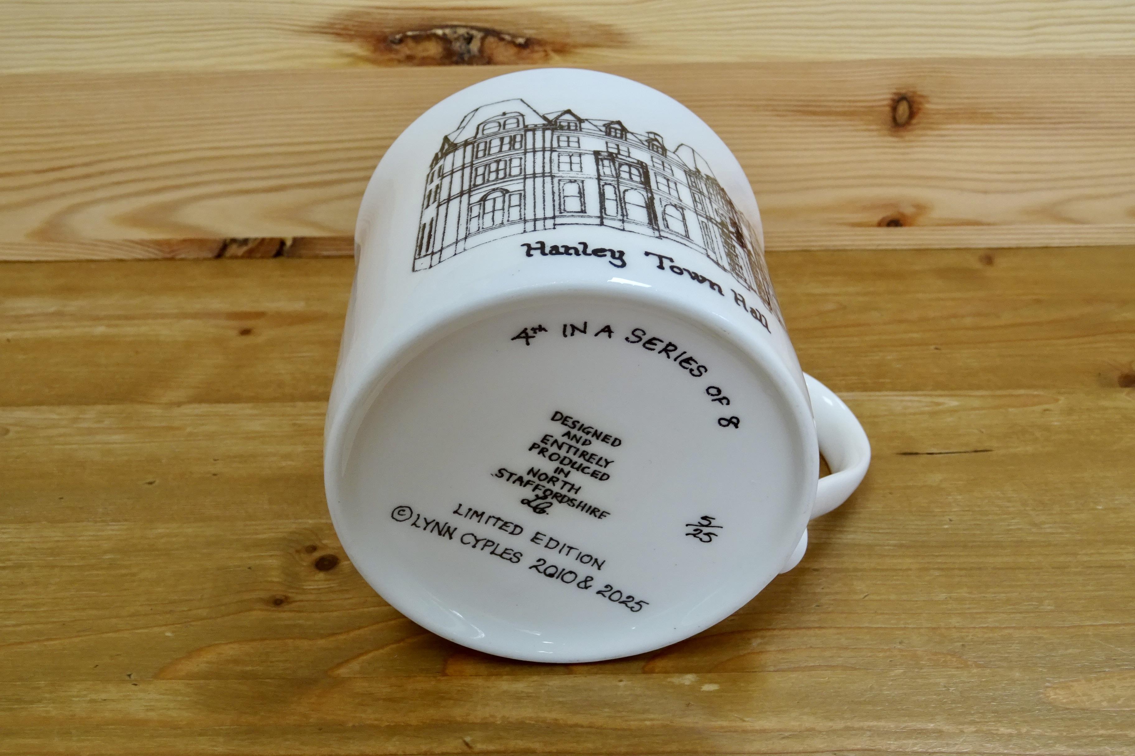 4th in a series of 8 Centenary Town Hall Mugs - Hanley Town Hall. Designed and entirely produced in North Staffordshire by Lynn Cyples. Limited edition of 25. Dimensions: 7.8cm high, 8.6cm wide, 11.8cm inc handle.