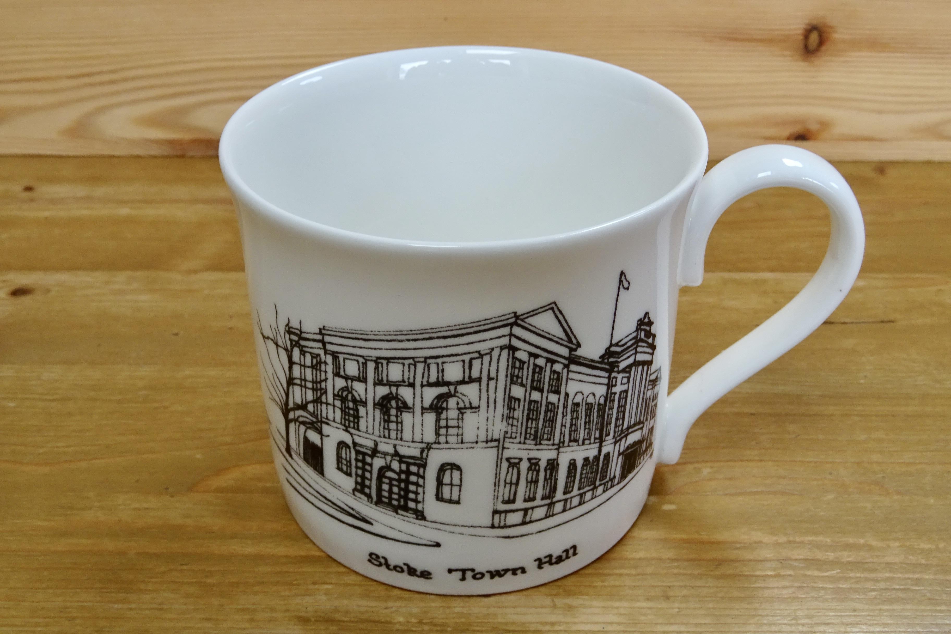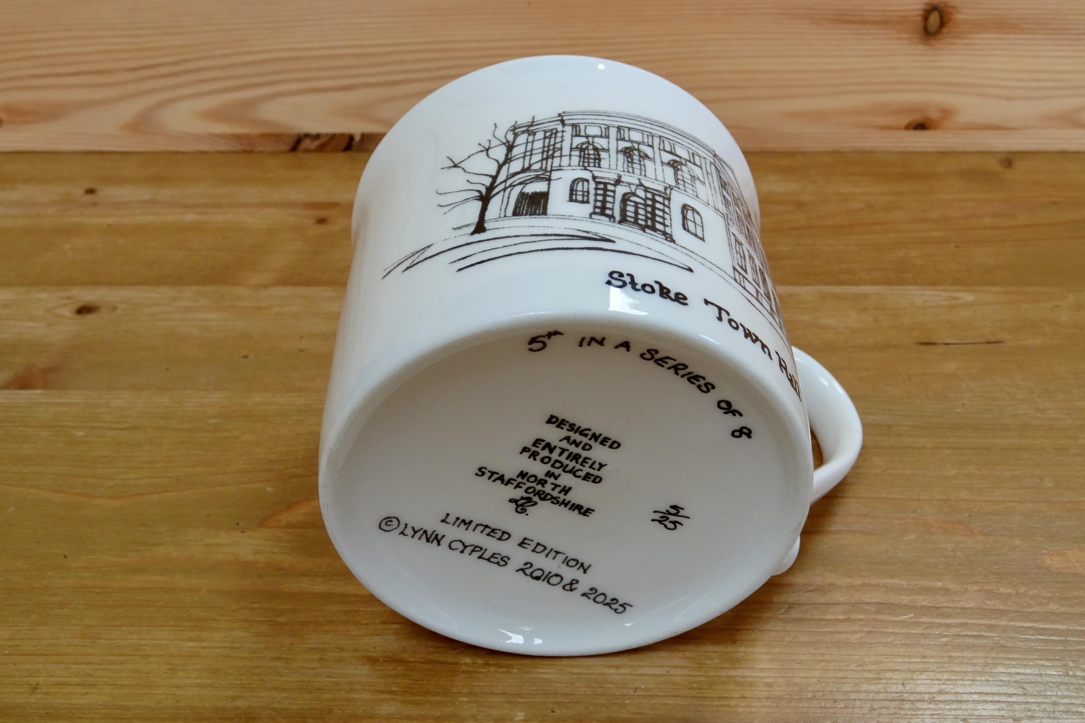 5th in a series of 8 Centenary Town Hall Mugs - Stoke Town Hall. Designed and entirely produced in North Staffordshire by Lynn Cyples. Limited edition of 25. Dimensions: 7.8cm high, 8.6cm wide, 11.8cm inc handle.
