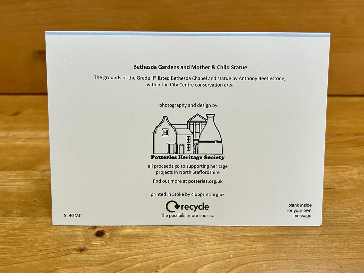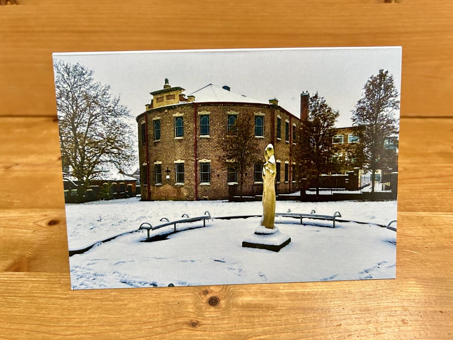 PHS Christmas Card with envelope. Photograph of Bethesda Gardens and Mother & Child Statue in the snow. A6 size (150mm x 105mm). Blank inside for your own message. Price: £2.00 Quantity *