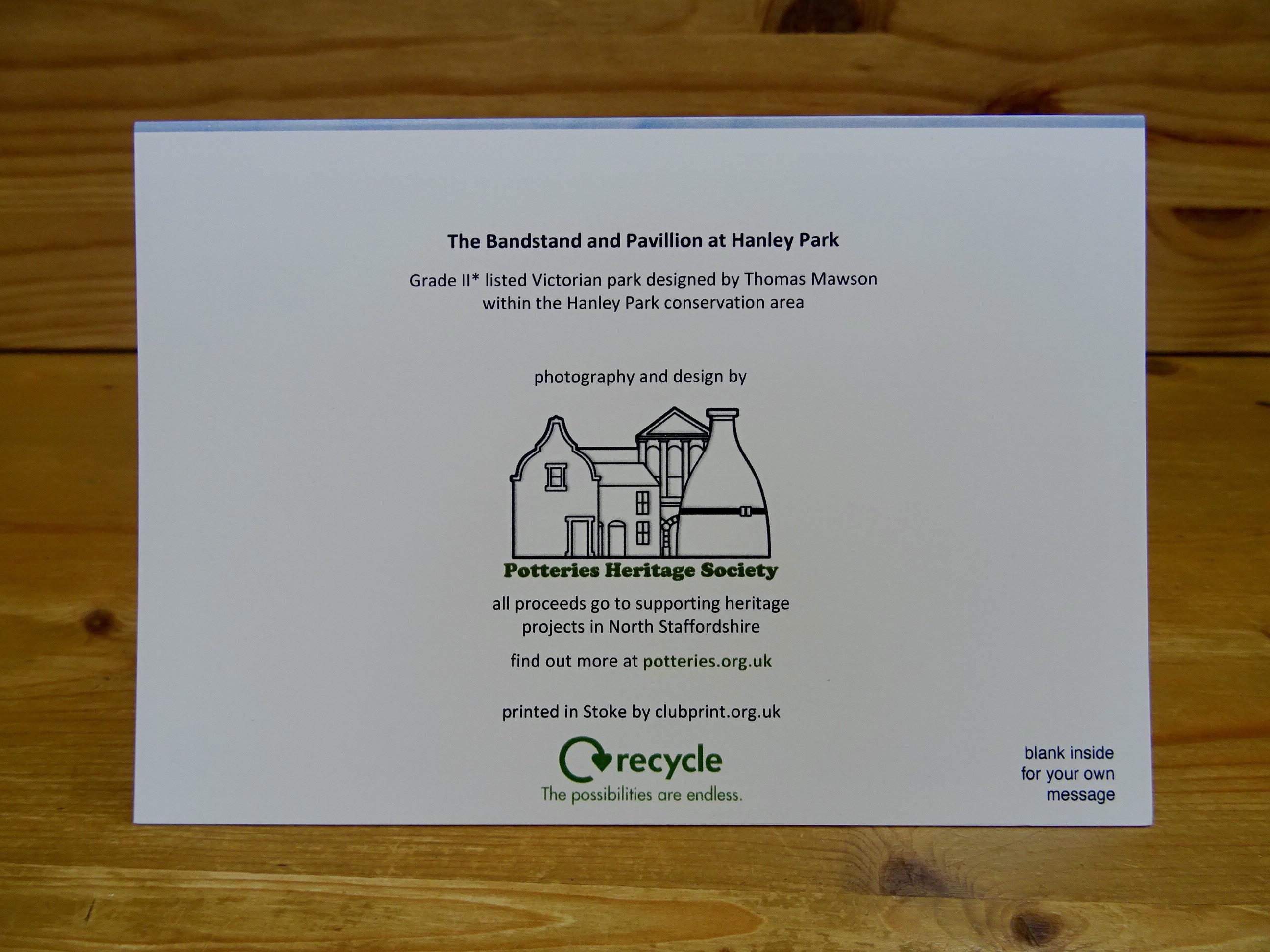 PHS Christmas Card with envelope. Photograph of the Bandstand and Pavilion in Hanley Park in the snow. A6 size (150mm x 105mm). Blank inside for your own message. Price: £2.00 Quantity *