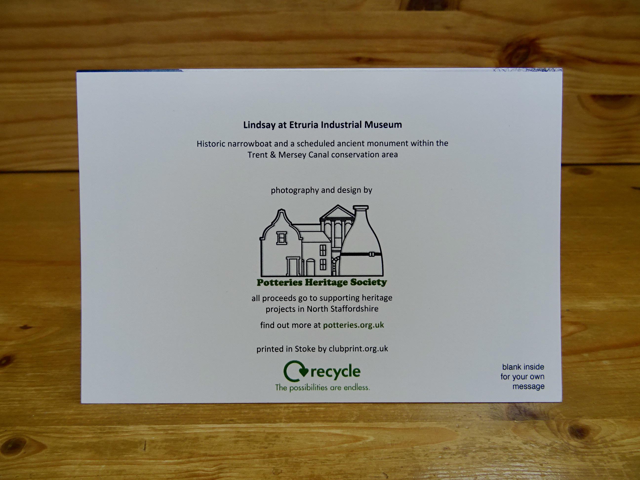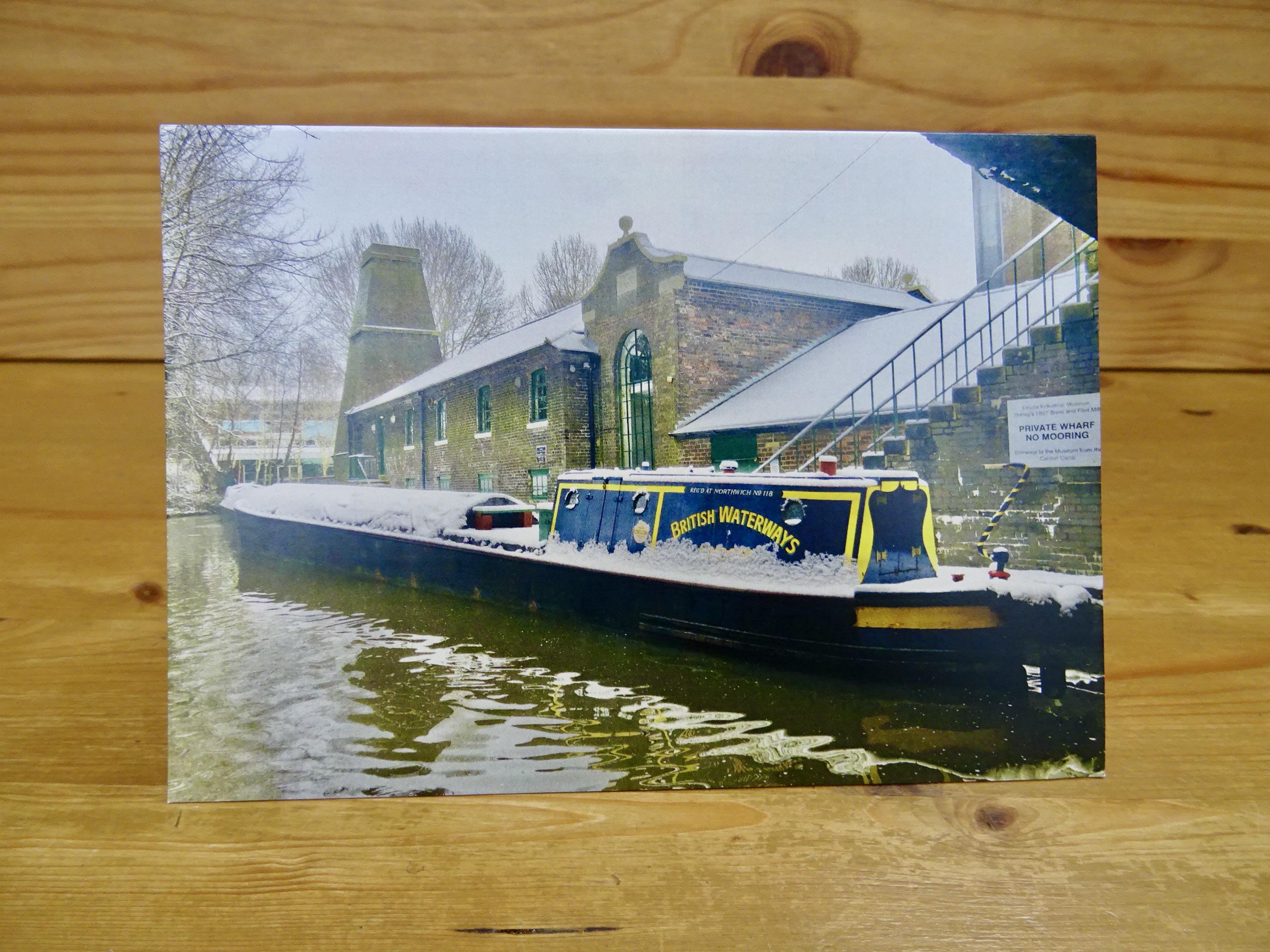 PHS Christmas Card with envelope. Photograph of historic narrowboat Lindsay in the snow at the Etruria Industrial Museum. A6 size (150mm x 105mm).