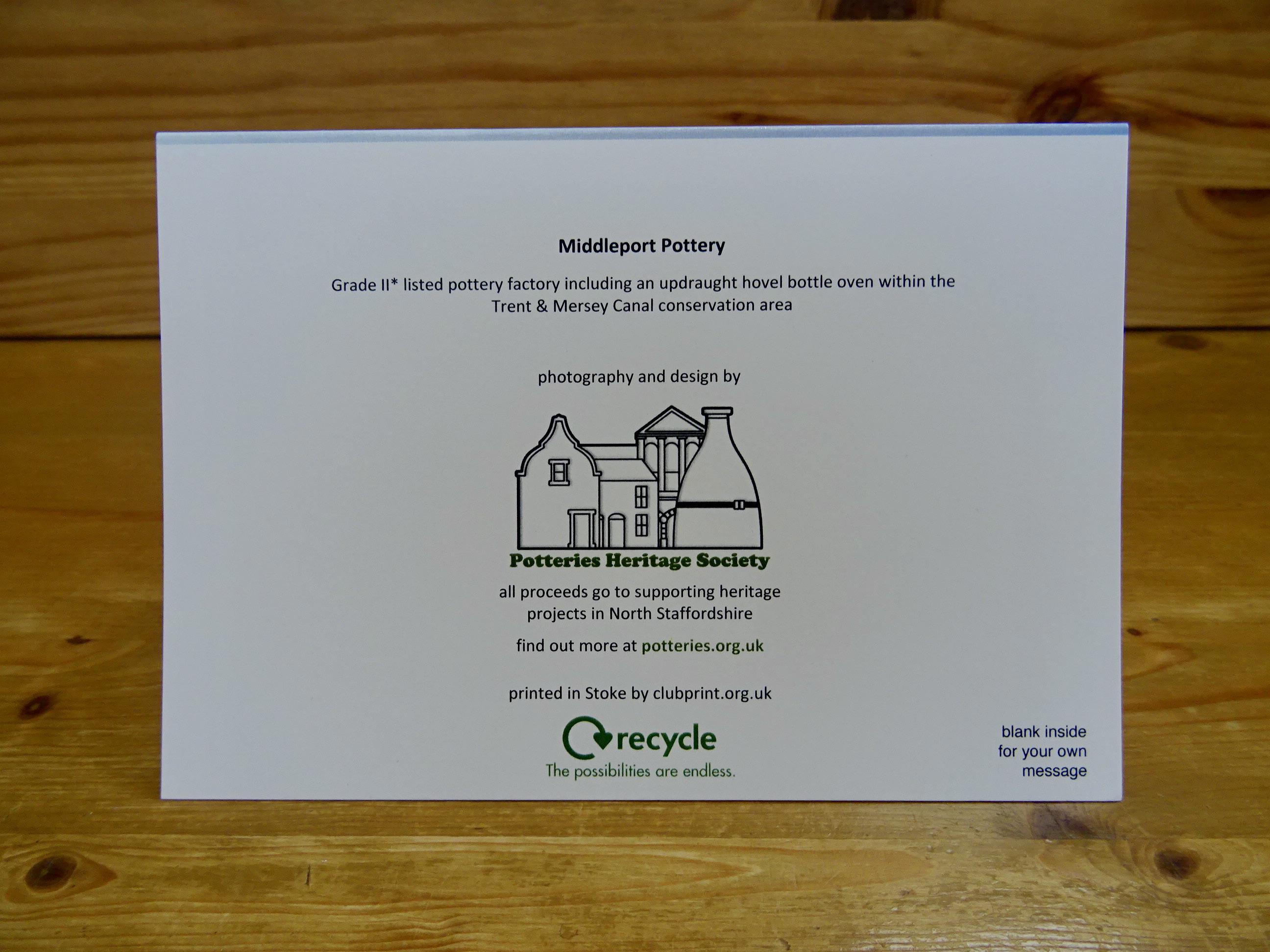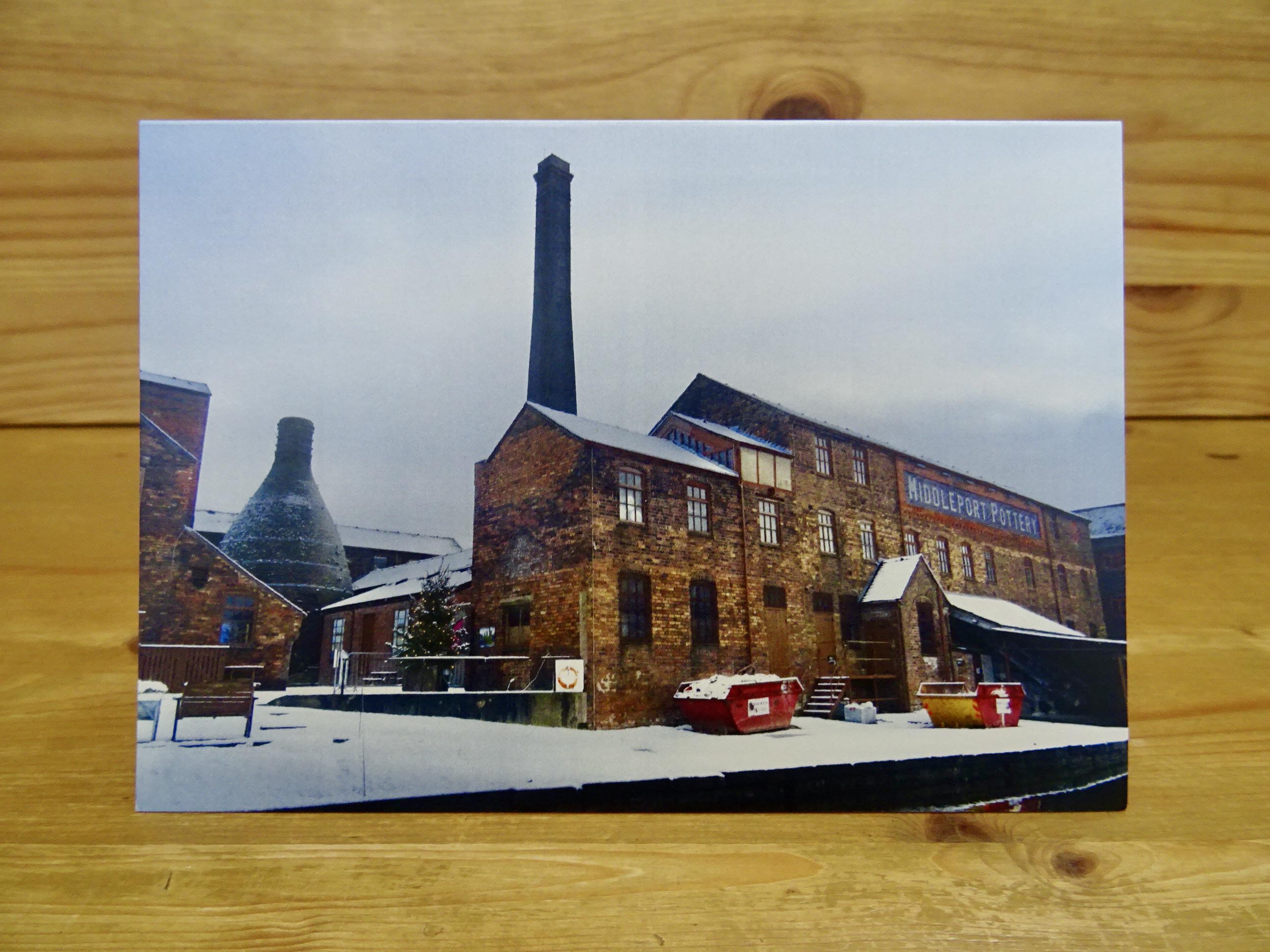 PHS Christmas Card with envelope. Photograph of Middleport Pottery in the snow. A6 size (150mm x 105mm). Blank inside for your own message. Price: £2.00 Quantity *