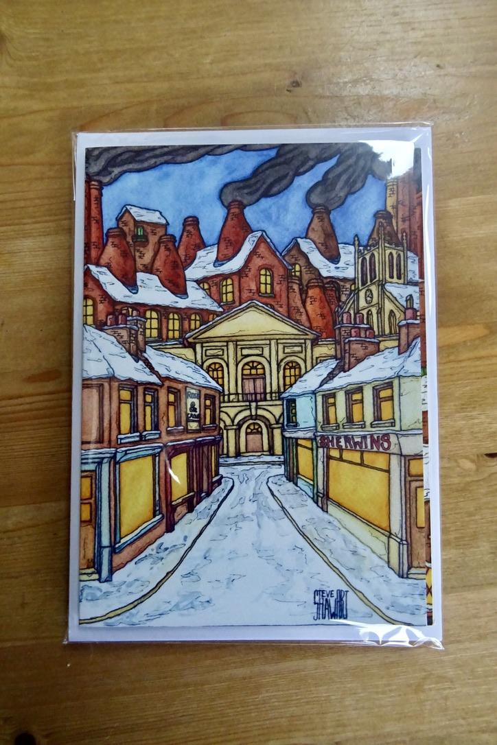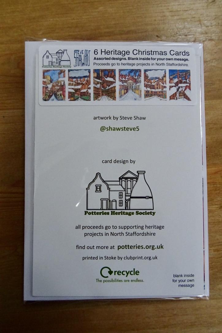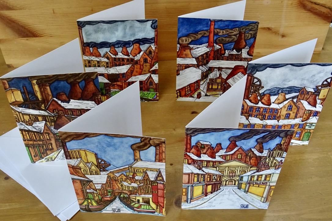 Pack of six Heritage Christmas cards with envelopes. Assorted designs with artwork specially commissioned from local artist Steve Shaw. A6 size (150mm x 105mm). Proceeds go to heritage projects in North Staffordshire.